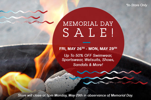 This Friday, May 26th through Monday, May 29th, save up to 50% OFF Swimwear, Sportswear, Wetsuits, Shoes, Sandals & More!*