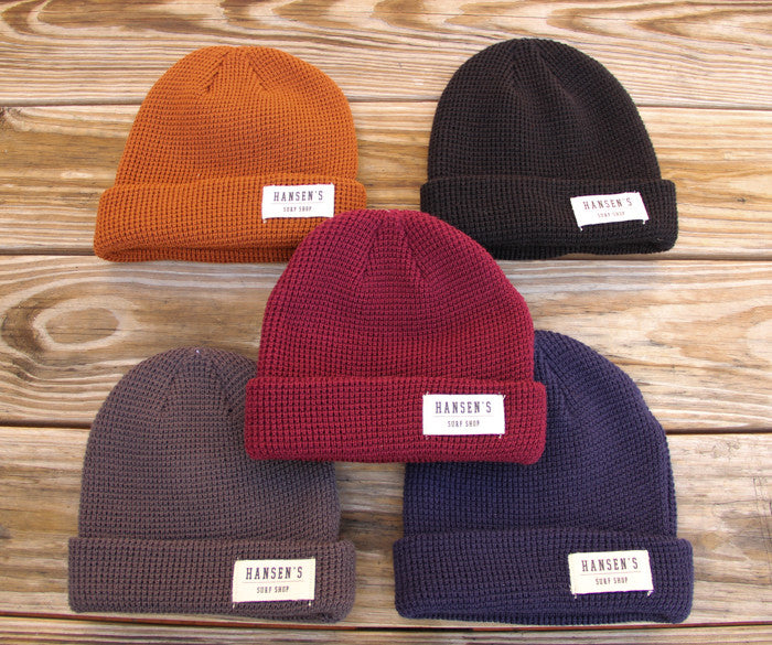 New Hansens Patch Beanie is a 100% Acrylic Solid Waffle textured beanie with Sewn On Patch Label