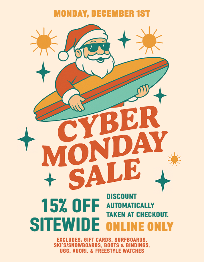Exclusions apply: gift cards, surfboards, skis/snowboards, boots & bindings, UGG, Vuori, and Freestyle watches.