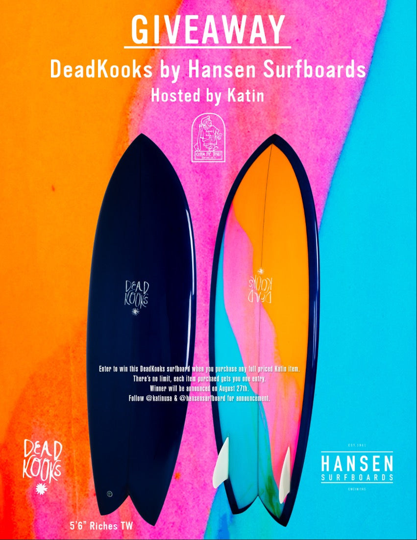 The winner will be announced on Monday, August 27 over at @KatinUSA Instagram. Be sure to follow @KatinUSA and @HansenSurfboards for winner info, future giveaways and more.