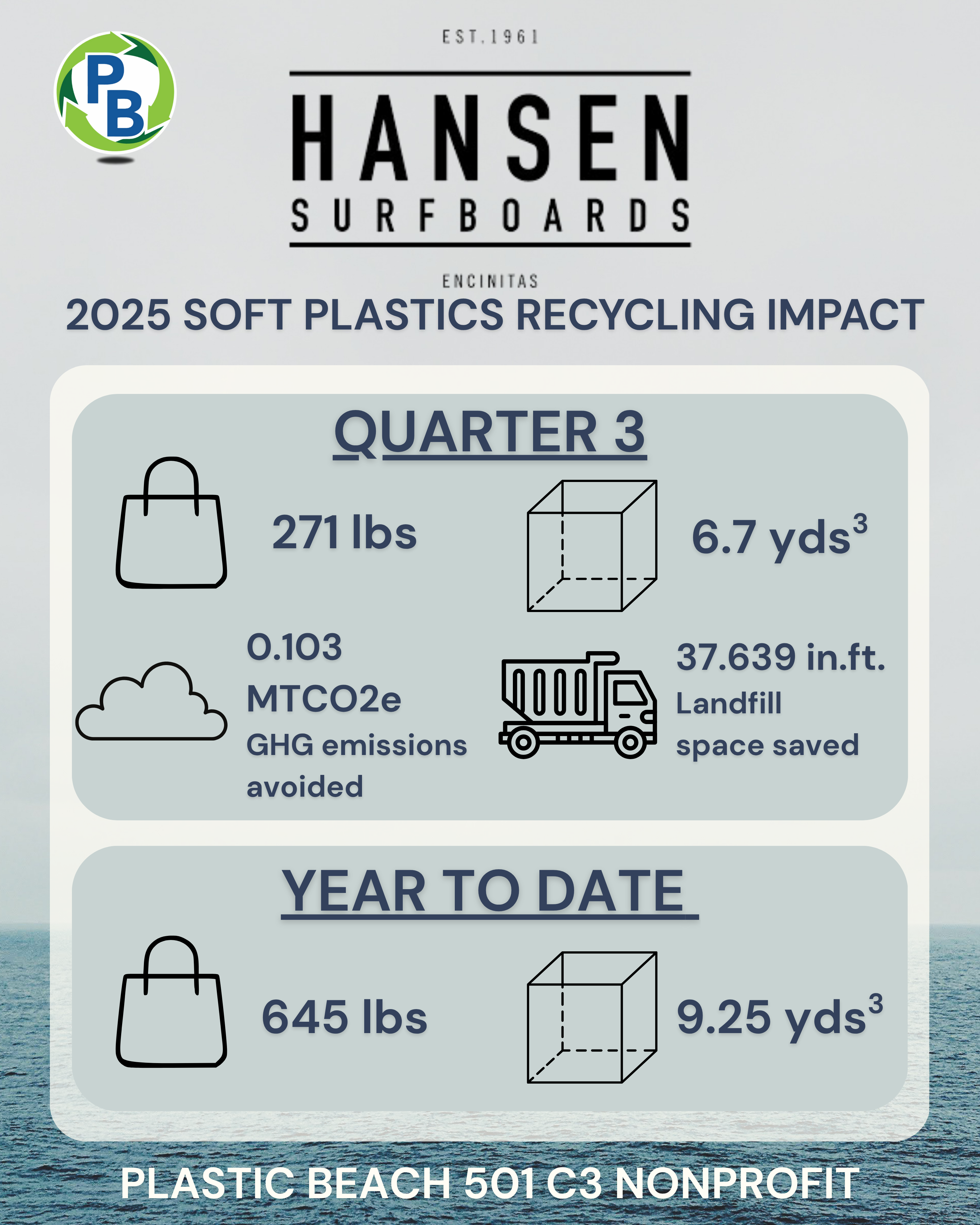 In Q3 2025, we recycled 271 lbs of soft plastics, saving 37.6 cubic ft of landfill space and avoiding 0.103 metric tons of CO₂ emissions.