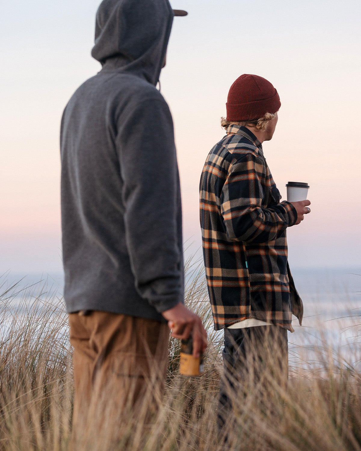 The star this season is the Eco-zy Polar Flannel — made from recycled polyester with a heavyweight, blanket-soft feel. It doubles as a shirt or light jacket, perfect over a tee or thermal. Traditional flannels round out the lineup in earthy plaids and midweights that feel broken-in from the first wear.